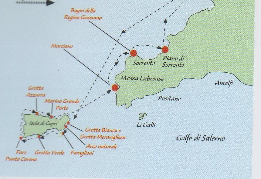 - Partenza dal porto di Sorrento per Capri con navigazione lungo la costa di Sorrento.Durante tragitto potrete ammirare il villaggio dei pescatori di Marina Grande,i bagni della Regina Giovanna,la cascata naturale che sgorga dalla roccia, ed altre attrazioni presenti lungo la costa .